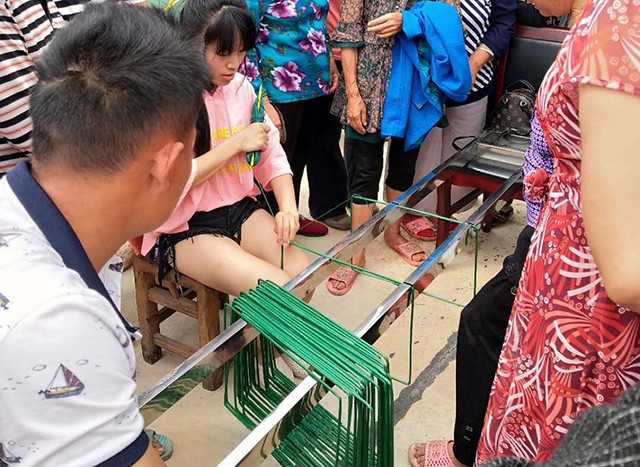 开班仪式结束后,学员们热情高涨、纷纷上阵,四名技师当场手把手教会近30人编织“地笼王”剪须、绞框、接龙筋、合笼身等工艺流程。