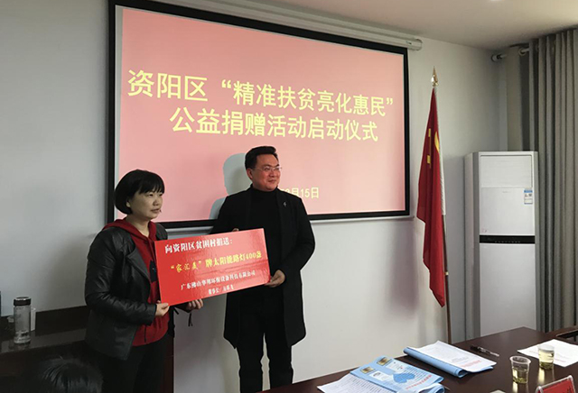 仪式上,爱心企业佛山市华邦环保设备科技有限公司向资阳区捐赠了价值近80万元的太阳能灯具,并以扶贫惠民价格在资阳区示范推广同类太阳能路灯产品。