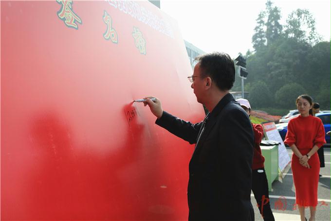 图为县委书记汤跃武在签名墙上签名 詹薇 摄