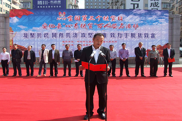 县人民政府副县长在活动中宣读了《全国第三个扶贫日“扶贫济困•你我同行”活动倡议书》,倡议社会各方力量伸出援助之手,集水滴成甘露,汇溪流成大海,汇聚社会各方资源,携手同心脱贫攻坚。