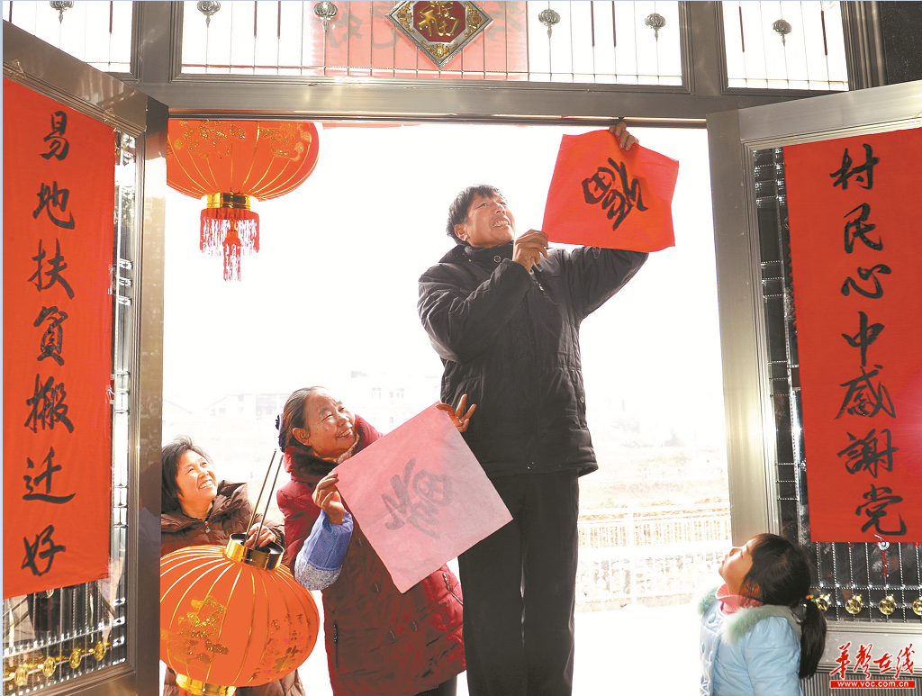 溆浦县祖师殿镇赤溪村易地扶贫搬迁户舒社文一家忙着贴对联,庆祝乔迁新居。(资料照片)周磊 摄