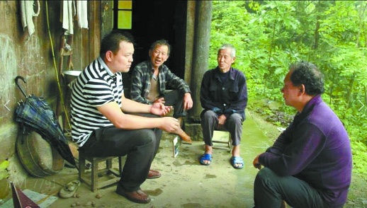 6月12日,安化县田庄乡白沙溪村,厚朴合作社负责人与贫困户蒋泽平(右一)交谈。