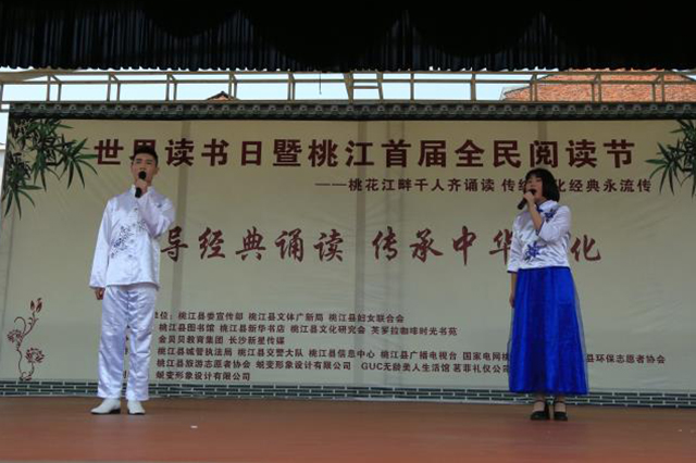 华声在线4月29日讯(通讯员 詹薇 记者 邢玲)“人之初,性本善。性相近,习相远……”4月28日,桃江县公众大戏台传来琅琅书声,该县千余名爱好阅读的师生、企事业单位员工和市民组成三十余个方阵,通过朗诵、舞蹈等形式展现“全民共读”的盛况,千余名观众朋友现场感受书香魅力。