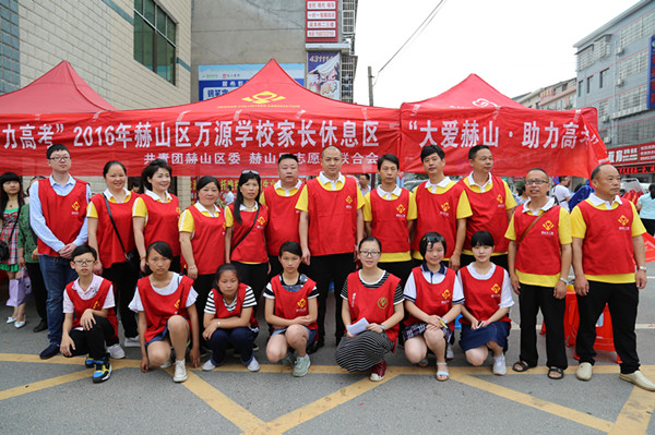 高考期间,共青团赫山区委和区志愿者联合会组织开展“大爱赫山·助力高考”活动,每天早上7点,志愿者们就赶到万源学校考点进行爱心护考,他们在考点入口处搭起凉棚,设置医疗服务站,摆放好文具、饮用水、降暑药、扇子、纸巾等供考生免费取用的物品。