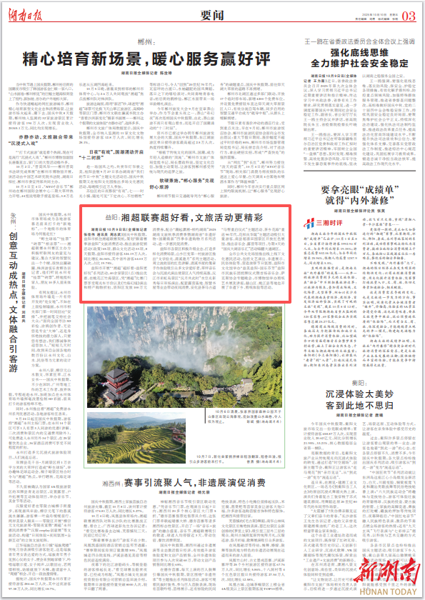 益阳市开展“‘湘超’超好看·益阳更好玩”系列活动,40余家景区(点)推出优惠。在桃花江竹海景区,凭“湘超”比赛门票享受观光车半价以及《竹海幻境》演出和特产购物折扣。资阳区发放100万元消费券,配合“潮起潇湘·相约湖南”2025湖南文旅秋季消费季暨湖南省“非遗好物·国潮焕新”四季非遗购物月系列活动,进一步惠民促消费。