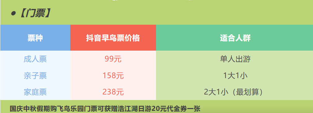 国庆中秋假期购飞鸟乐园门票可获赠浩江湖日游20元代金券一张