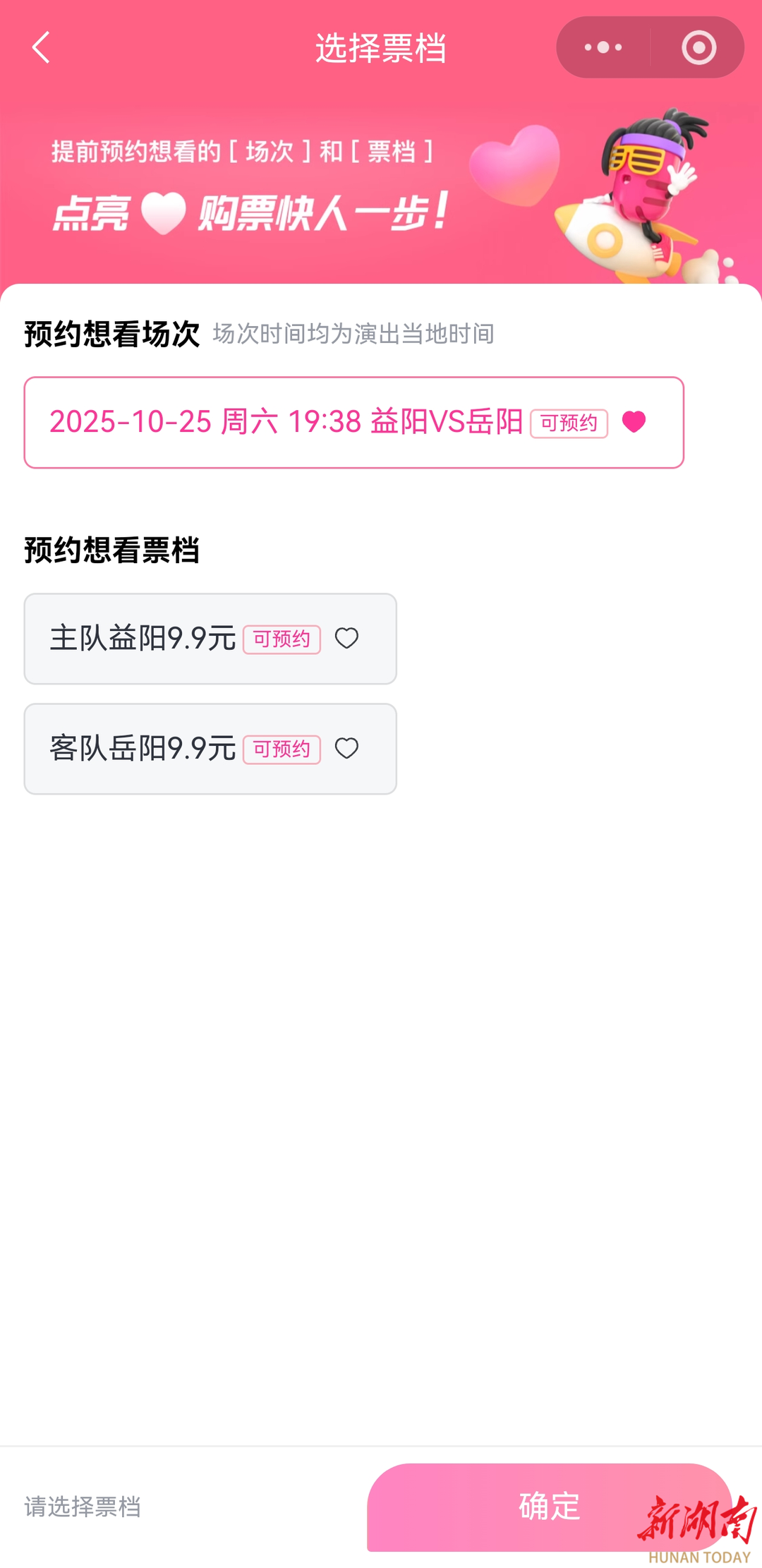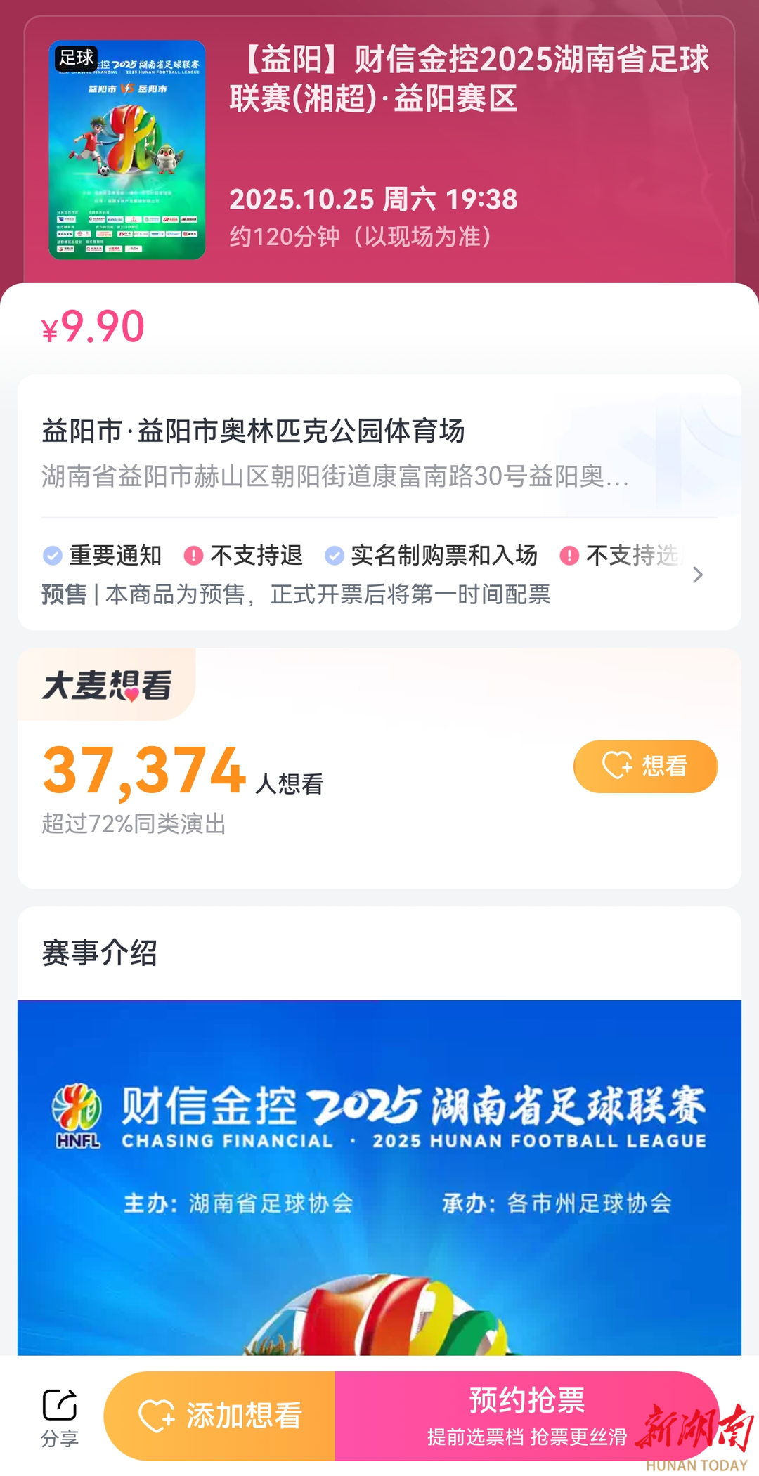 湖南日报·新湖南客户端10月21日讯(记者 张佳伟)10月25日晚,“湘超”联赛益阳队主场迎战岳阳队目前正式开启预约抢票通道。