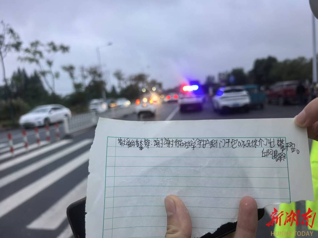 湖南日报·新湖南客户端10月22日讯(通讯员 徐钢 曹晓艺)“敬爱的交警叔叔,谢谢你在校门口守护我们,祝你们出警平安!”这是益阳市大通湖区公安局交管大队民警廖柯前天在执勤中收到的两名小学生写的便笺。“看到这行字,我当时眼泪都要出来了,站在萧瑟风雨中的我感觉心里暖暖的。”廖柯说道。