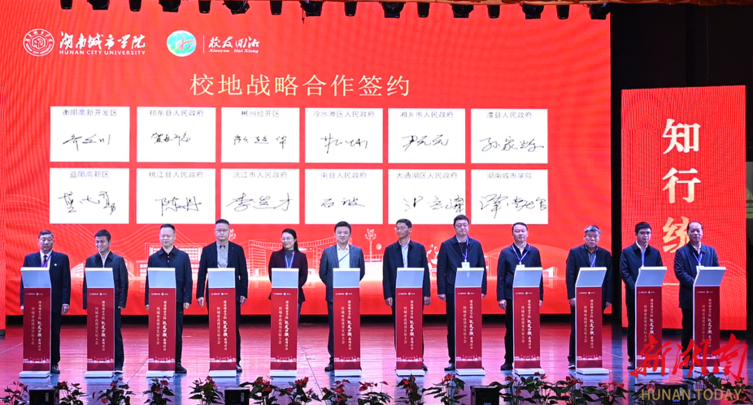 湖南城市学院副校长谭献良、孙倩、雷存喜代表学校分别与衡阳高新开发区、祁东县人民政府等11个地方政府签订校地战略合作协议,与中核二三建设有限公司西南分公司、湖南省地质工程勘测院有限公司等10家企业签订校企就业基地协议,与中规院(北京)规划设计有限公司、中国核工业二四建设有限公司等15家企业、学校签订产教融合实习基地。