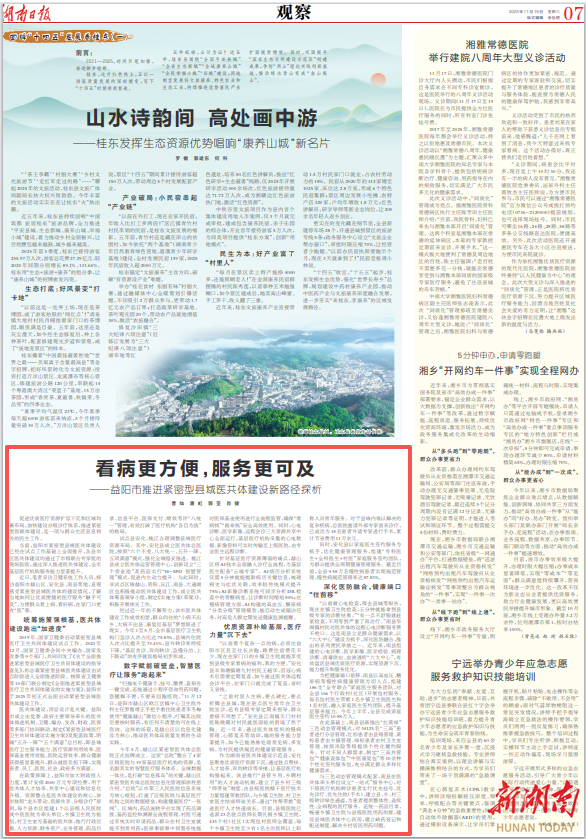 近日,笔者采访卫健系统工作人员,探访益阳市赫山区、安化县、南县等地,直观感受紧密型县域医共体的建设情况,了解当地如何让优质便捷的医疗服务“触手可及”,方便群众看上病、看好病,在家门口更有“医”靠。