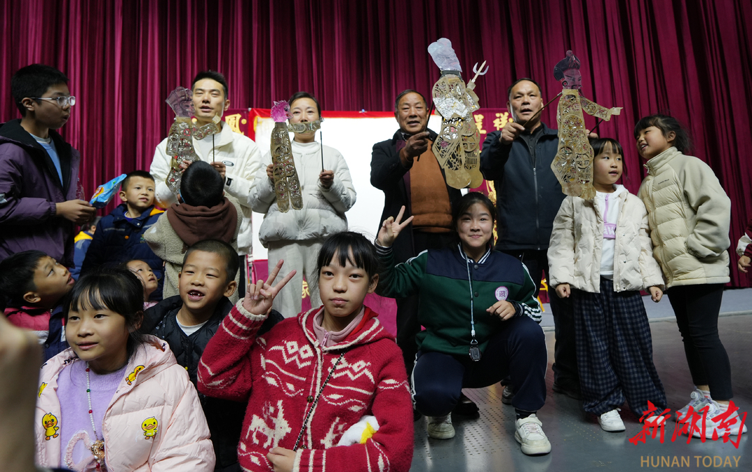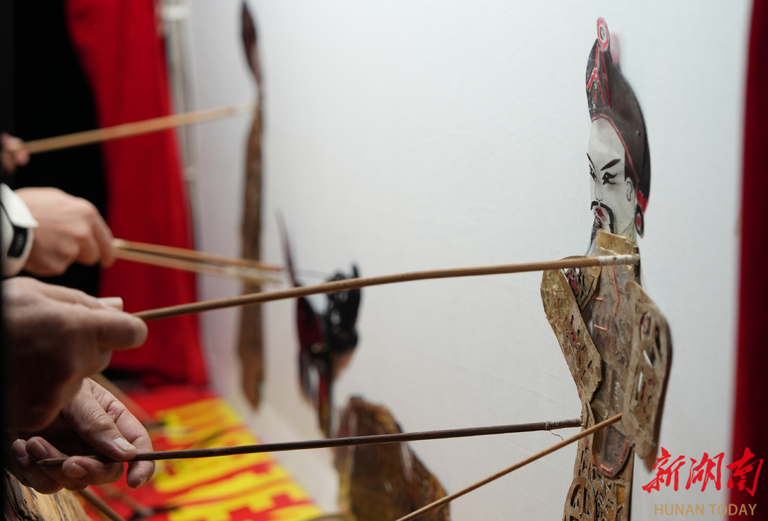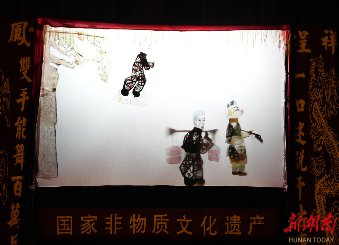 长沙市望城区皮影艺术团负责人朱国强在幕后操作。