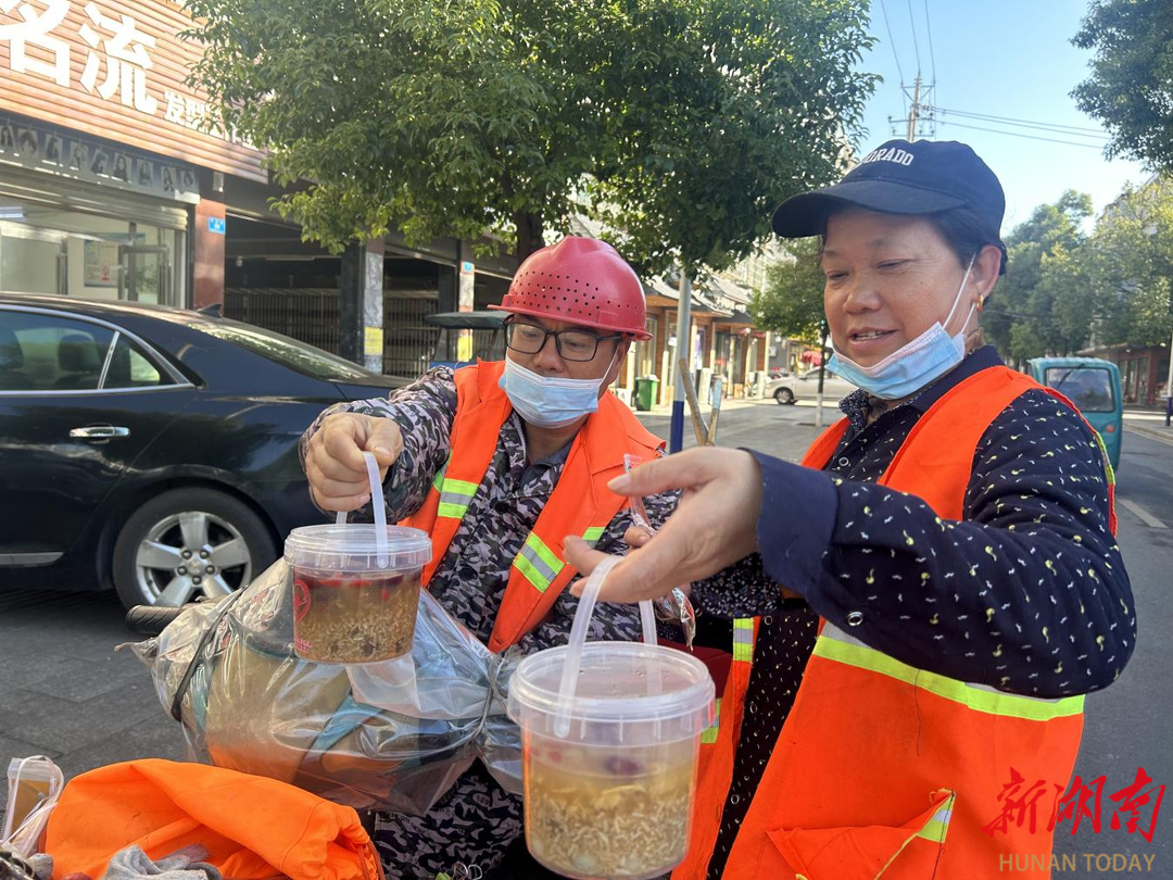 志愿者正在为环卫工人发放甜酒冲蛋。李鑫宇 摄