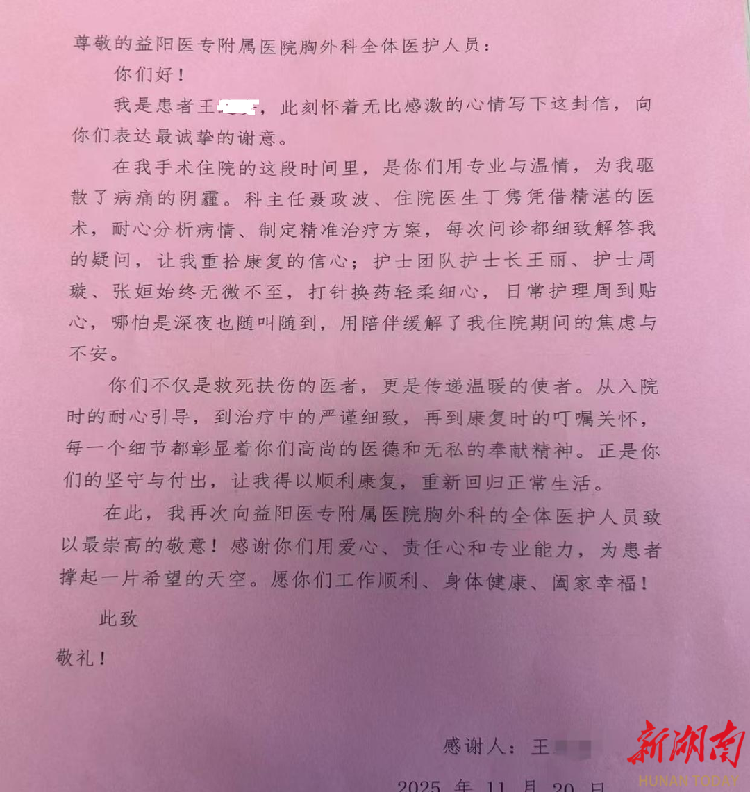 近日,益阳医专附属医院胸外科的医护人员们,收到了一份沉甸甸的心意——患者王老先生书写的感谢信,以及他和家属专程送来的锦旗。“悉心呵护如亲人,精湛医术解民忧”,锦旗上的字,道尽了老人住院期间的深切感动。