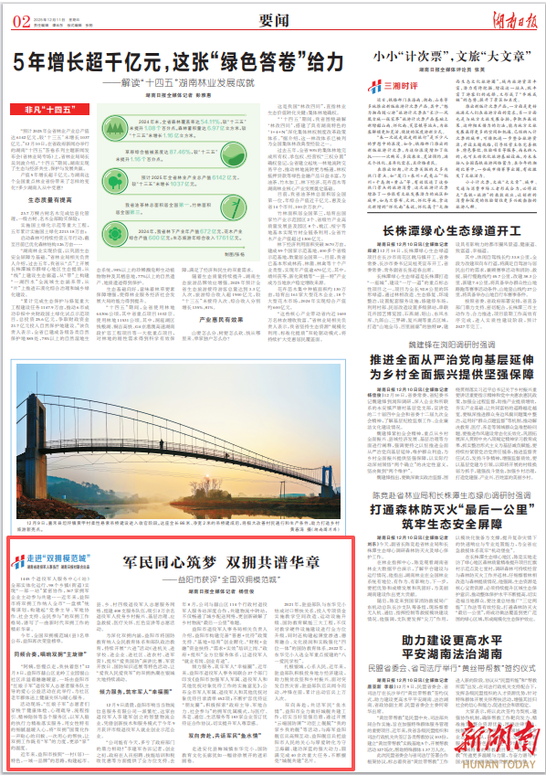 1445个退役军人服务中心(站)全部实体化运行,98个乡镇(街道)实现“一部一站”紧密协作,367家拥军企业主动参与共建……近年来,益阳市将双拥工作纳入全市“一盘棋”统筹谋划,构建起“党委主导、军地协作、社会支持、全民参与”的双拥工作格局,谱写了一曲新时代双拥工作的精彩华章。