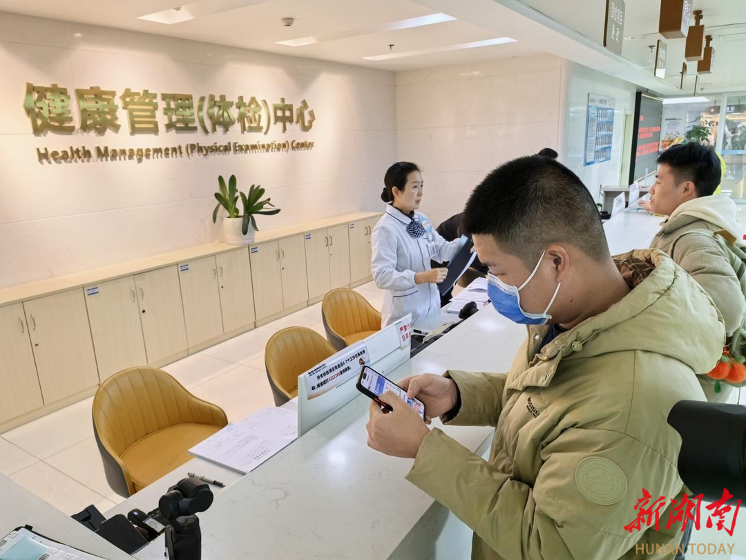 1月27日,市民何文胜在益阳市中心医院体检中心用手机APP领取福袋优惠准备做体检。 肖健 摄
